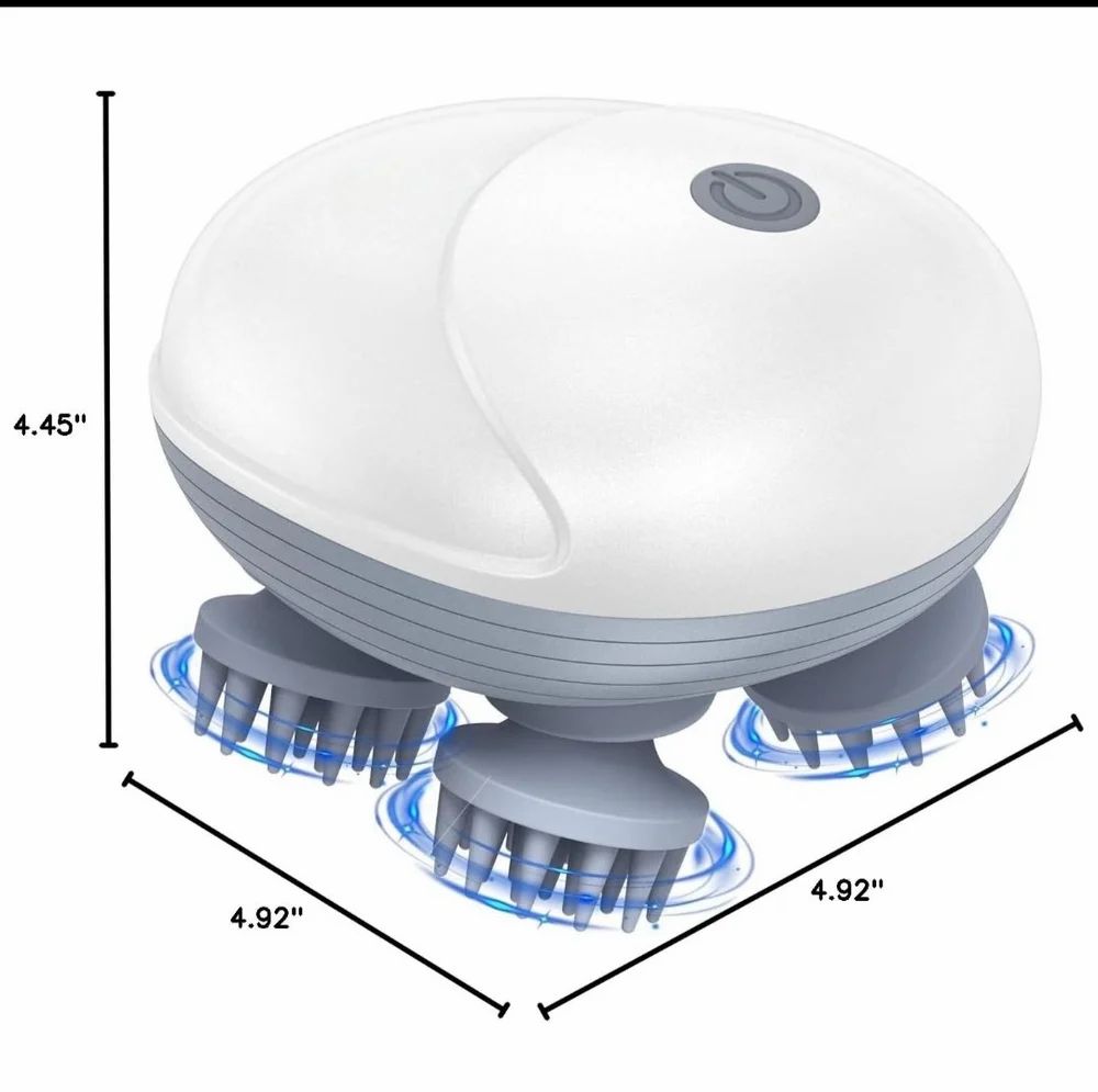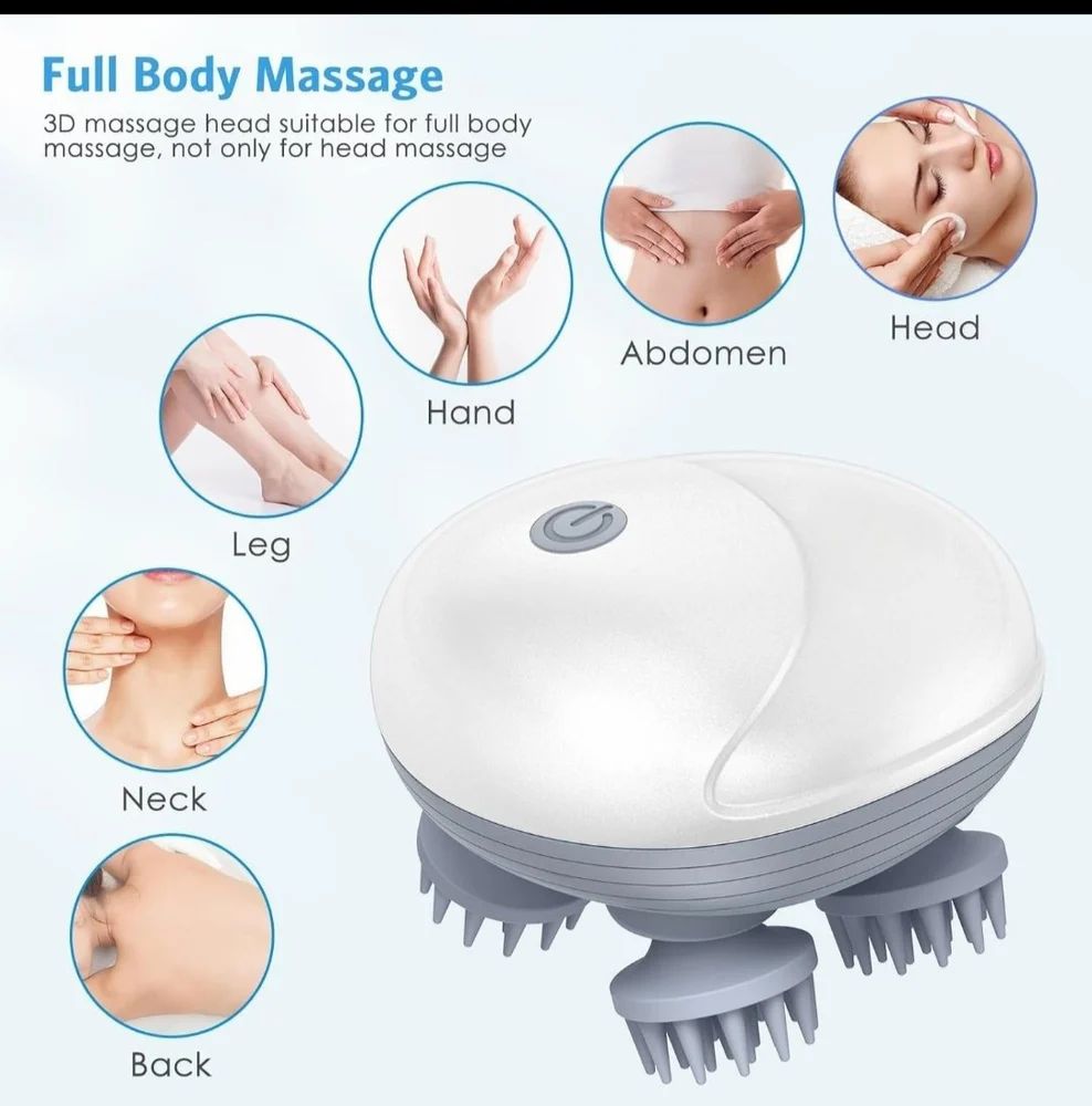 Rechargeable, waterproof scalp and body massager with 96 silicone kneading points and detachable heads for relaxing massage at home or on the go.